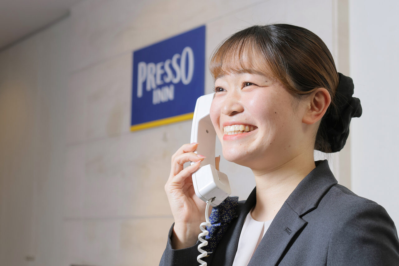 フロントスタッフとして、主にチェックイン・チェックアウトおよび電話対応に従事しています。ほかにも、バック業務として、先の予約を確認したり、宅配便資材の在庫チェックなども行っています。