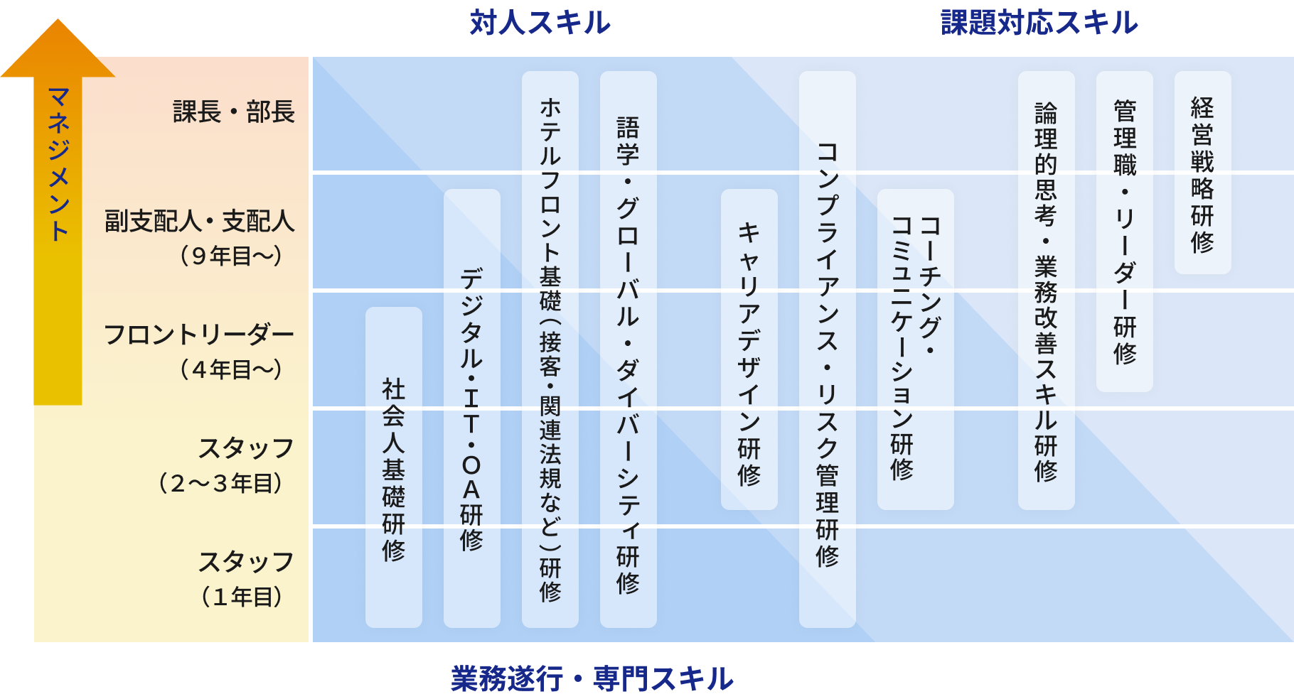 スタッフ、フロントリーダーなど各階層で学ぶ研修と、コンプライアンスなど京王プレッソインの社員全員が定期的に学ぶ研修など、社員のステージに合わせた研修があります。